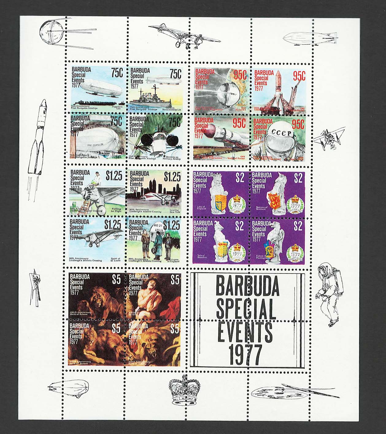 Barbuda 1977 Special Events m/sheet sg383 space, ships, planes thematic 3x unmounted mint examples – one for each theme [ref 291-14/l/6a2284]