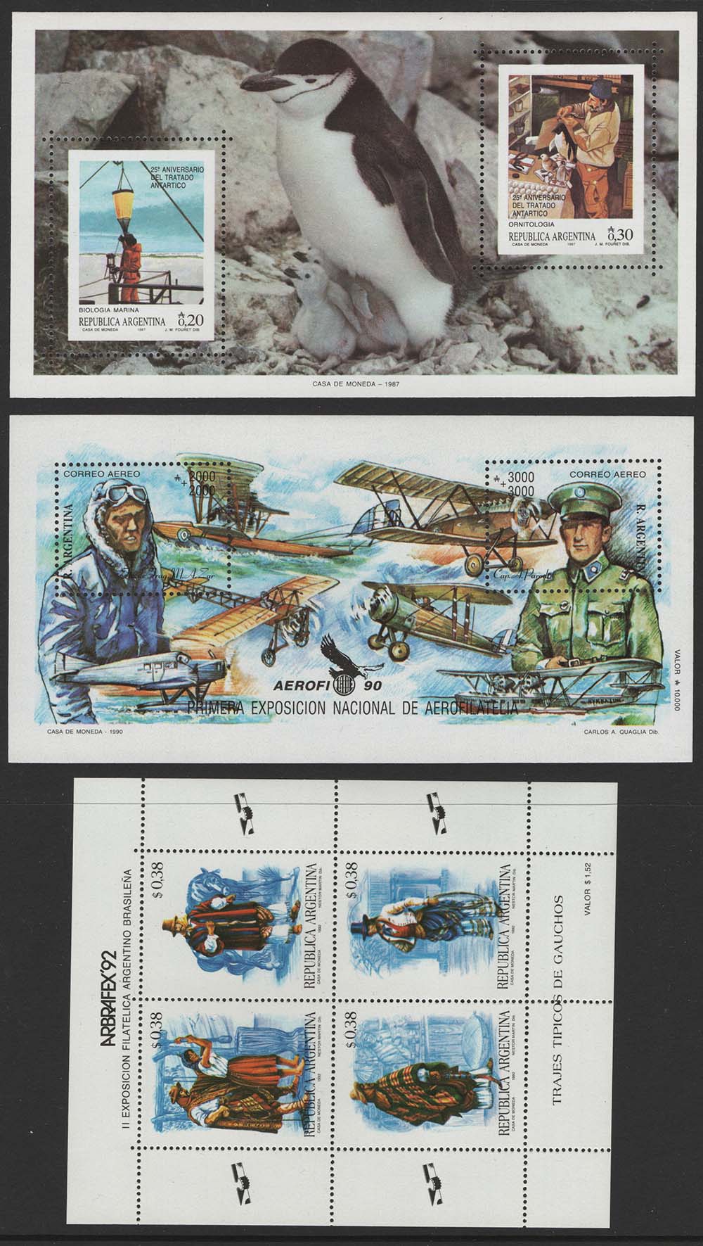 Argentina 1987 Antarctic Treaty Penguin m/sheet unmounted mint, 1990 Airmail Exhibition, 1992 Abrafex92 m/sheets unmounted mint sg2032, 2244, 2278 [ref 293-29/l/ak0245]