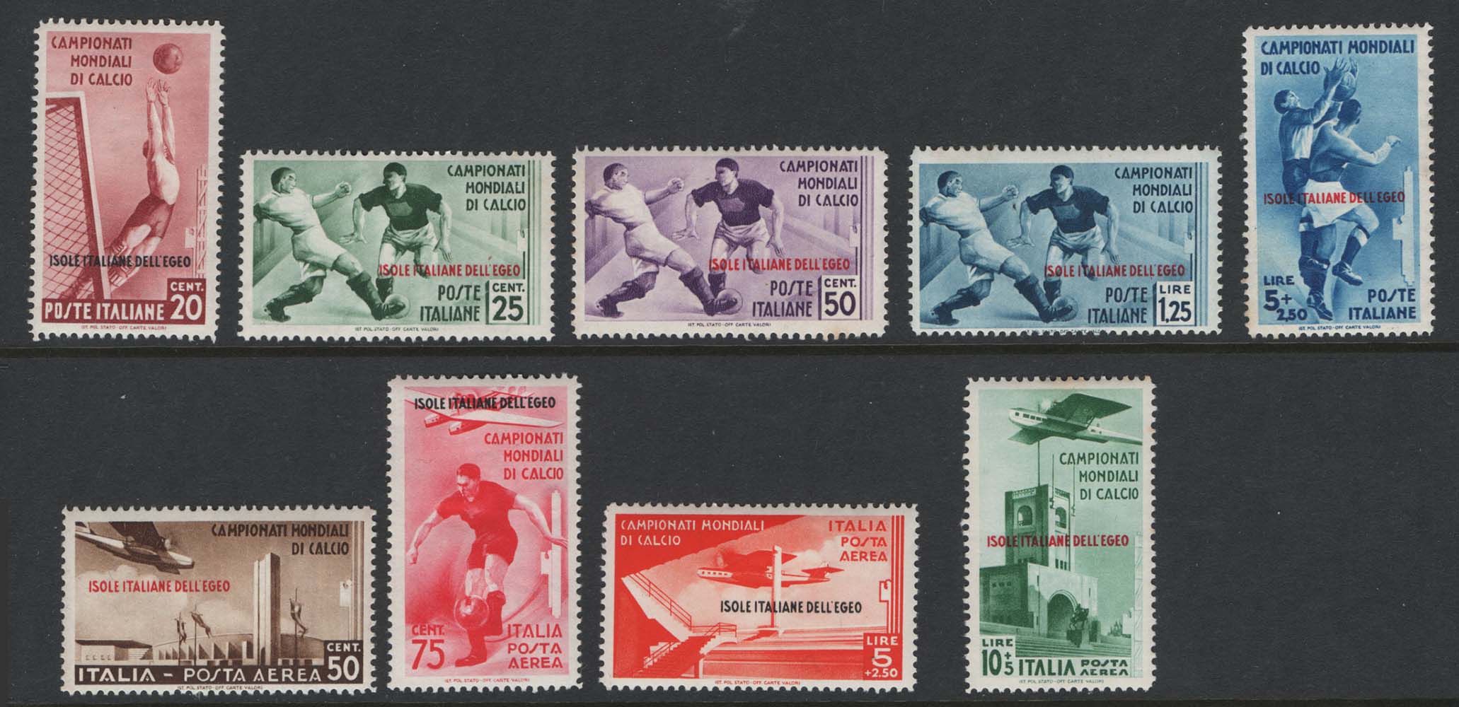 Dodecanese Is 1934 World Football set of 9 Aegean Is ovpt sg128-36 fine mint (minor gum fox) cat £850 [ref: 294/36 sa/ac0484]