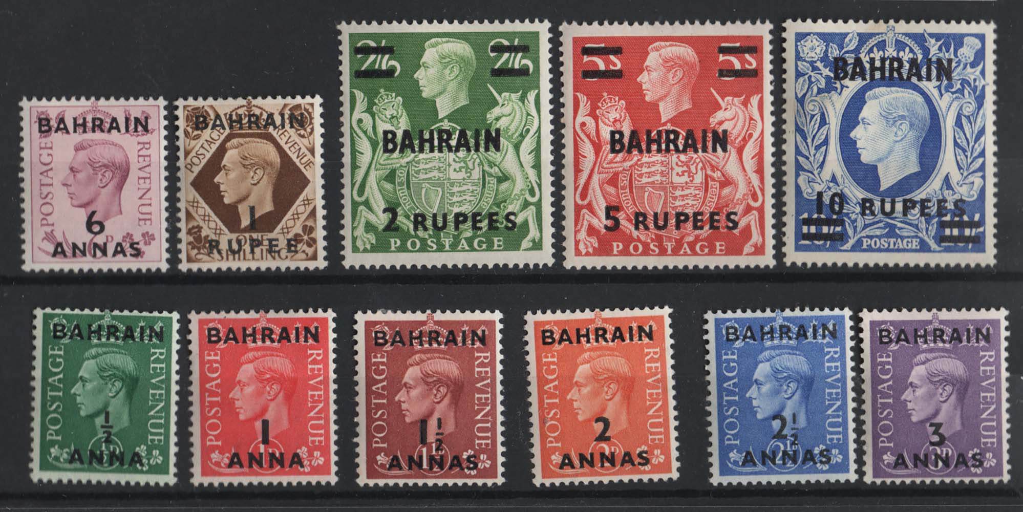 Bahrain 1948 ½a – 10r ovpt set of 11, sg49-59 f mint c£100 ae0361 sa 289/ #040