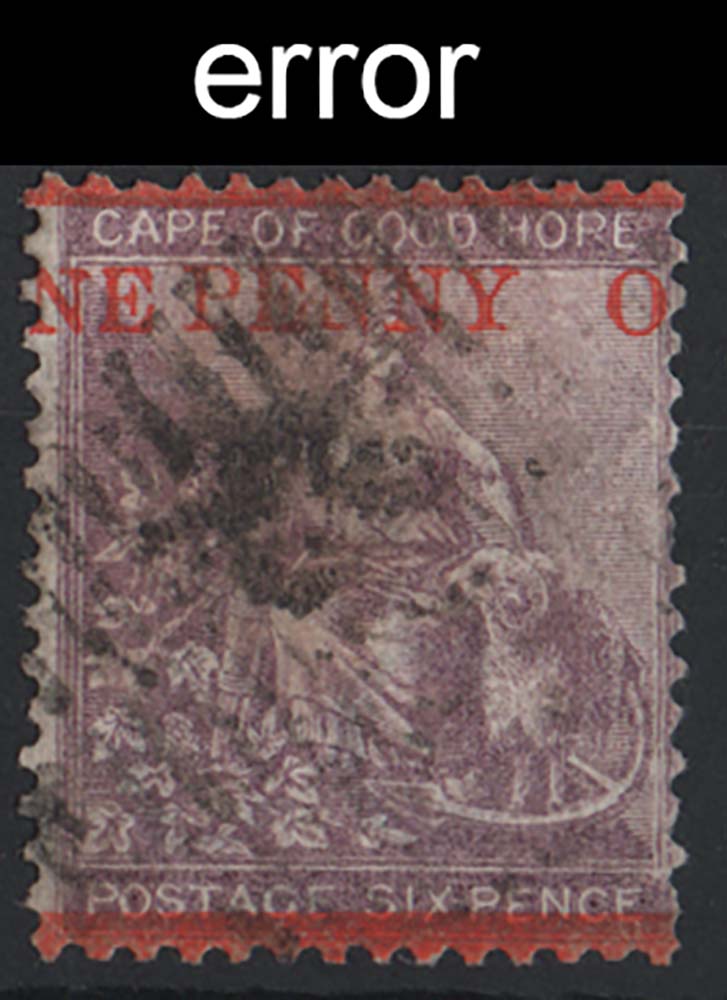 Cape of Good Hope 1874 1d on 6d sg32 very good used, variety – ‘NE PENNY O’ surcharge cat £160+ [ref 291-45/sa/ai0599]