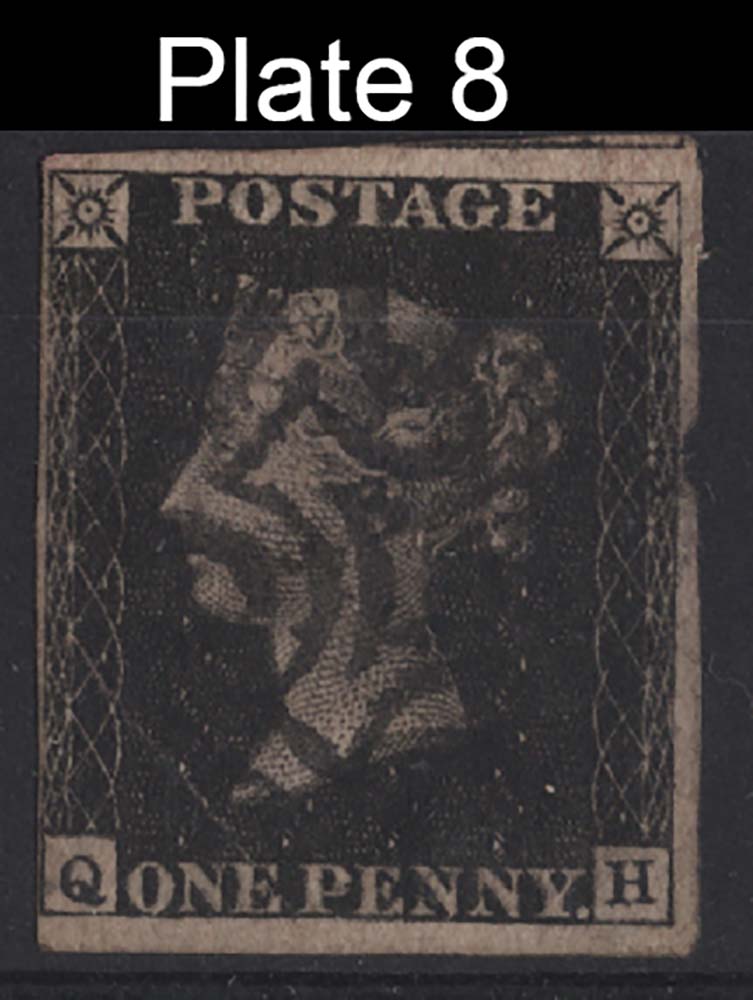 1d black plate 8 QH gu, 4 close to good margins, dented at right, shallow thin, neat black MX sg2
