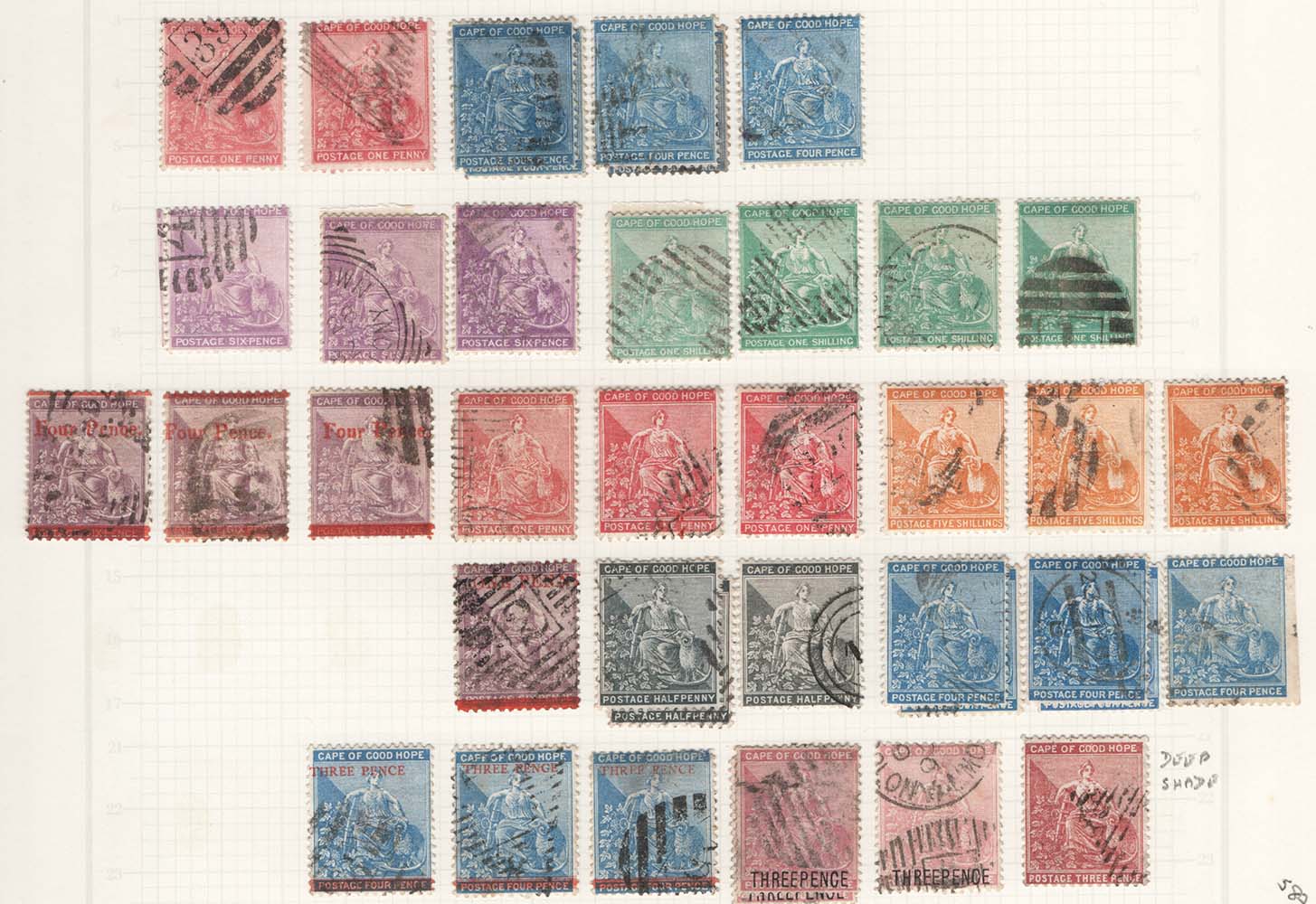Cape of Good Hope 1871-1880 used range with shades: 14 with frame, various surcharged, without frame incl 3x 5s, mostly fine cat £700+ [ref 291-57/b07/ai0603]