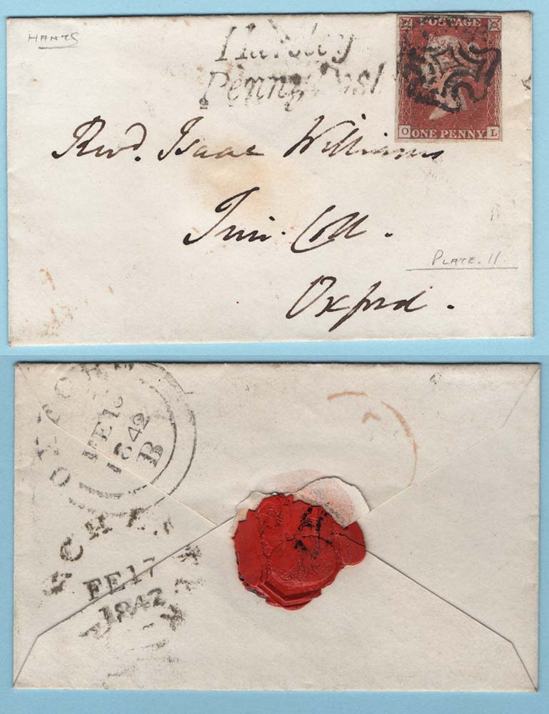 GB 1841 1d red from black plate 11 OL very good used on cover with Hursley Penny Post alongside, 3 good margins, 4th close cat £350 sg7 [ref: 294/65 s/9s0289]