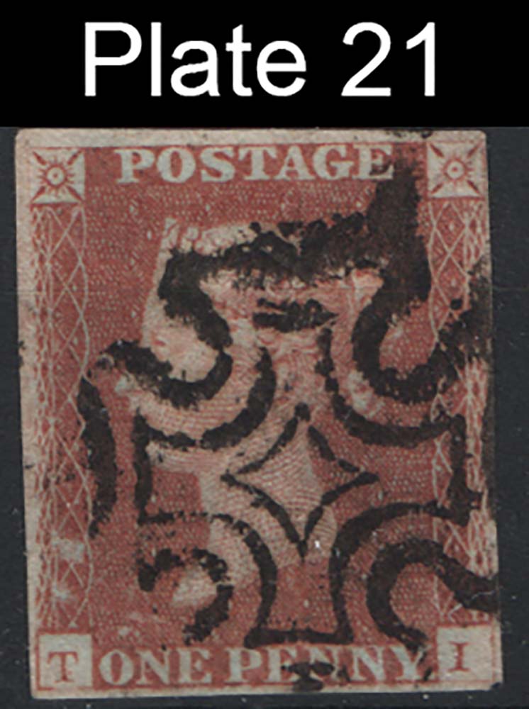 1d red plate 21 TI vgu, 4 close margins, MX cancel sg8 c£60