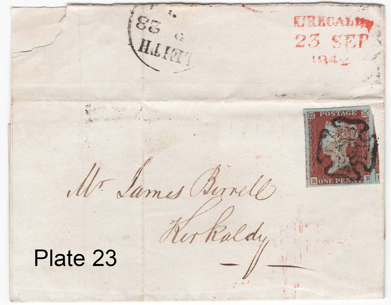 1d red plate 23 RB fu, 4 large margins, with neat MX on EL, Leith to Kirkaldy c£120 sg8