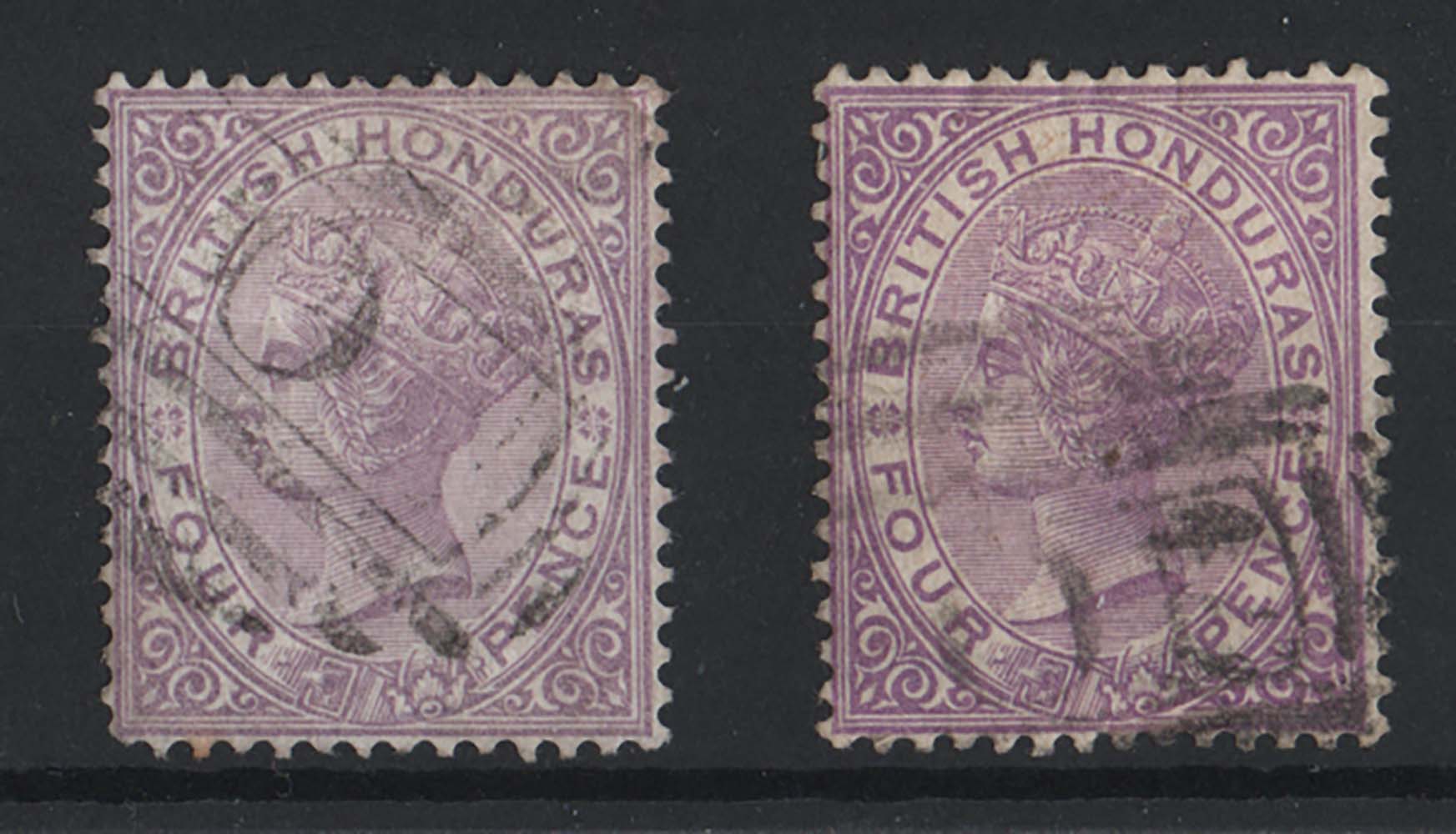 British Honduras 1872 4d mauve perf 14 wmk ‘double lined O’ fu, another with sheet corner lines wmk, sg14 ae0403 sa 289/ #085