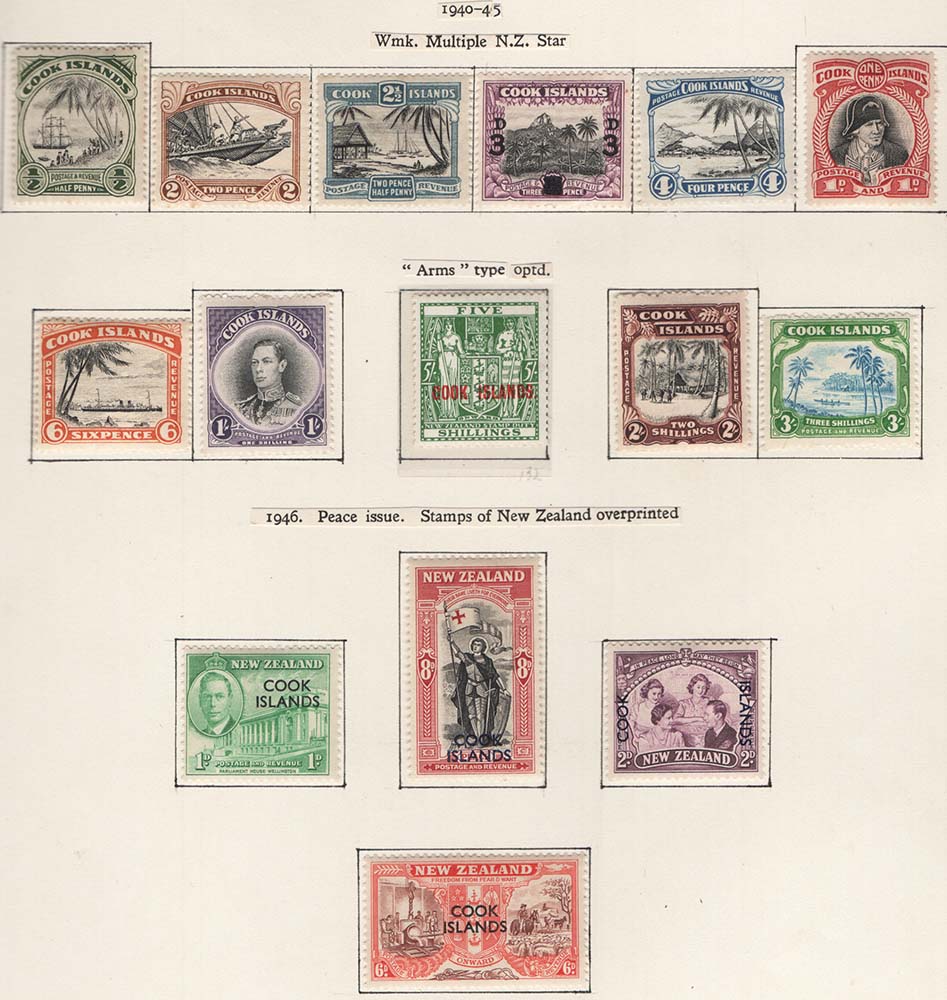 Cook Is 1944 ½d – 3s set of 10 fine mint sg137-145, also 5s postal fiscal sg132 and 1946 peace set cat £133 [ref 293-97/b07/ak0131]