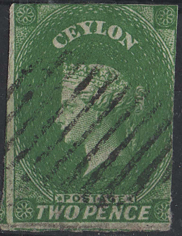 Ceylon 1857 2d green sg3, fu, 2 enormous margins at left & bottom, close at top, into at right, neat datestamp ae1012 sa 289/ #113