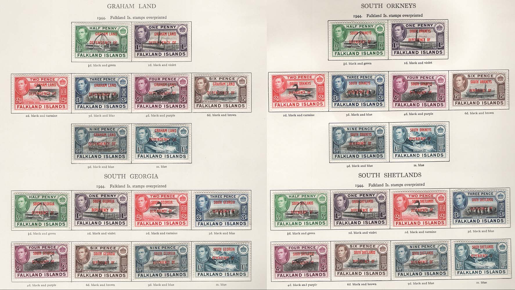 Falklands Deps 1944 The 4 sets of 8, Grahamland, South Georgia, etc ½d – 1s fm
