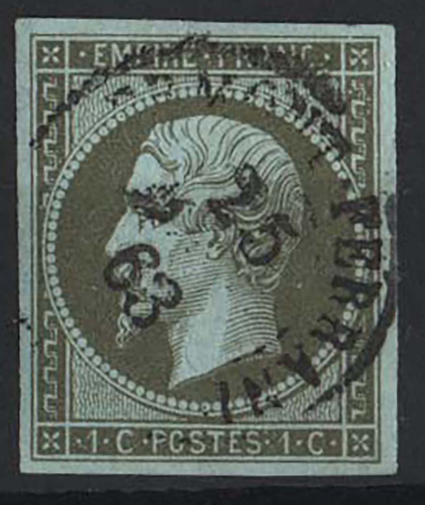 France 1853 Napoleon 1c olive-green/bluish sg42 vfu cds, 4 good margins c£120 ae0821 sa 289/ #124