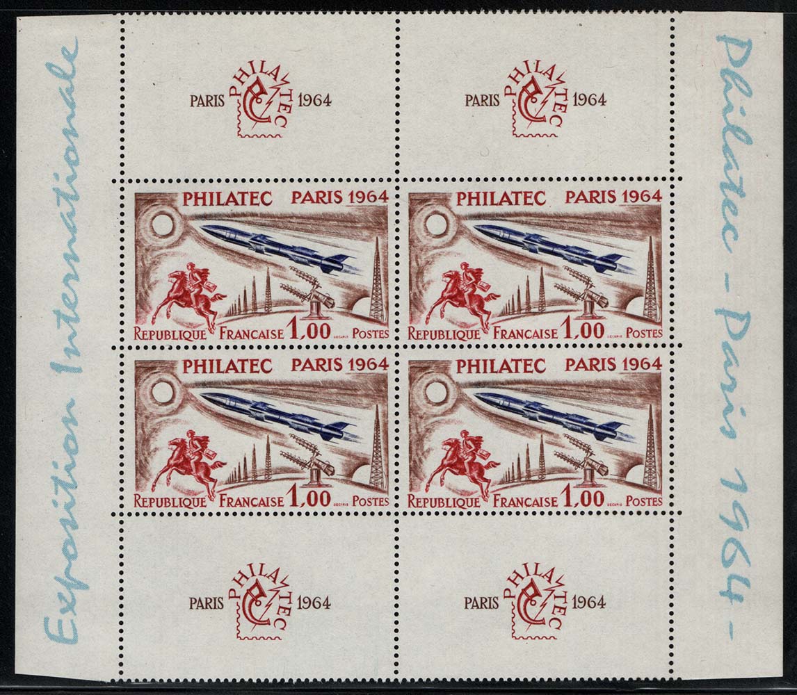 France 1964 Philatelic Exhibition 1f in unmounted mint block of 4 sg1651 light mount in margin, stamps unmounted mint cat £168 as singles [ref 293-136/b08/ak0449]