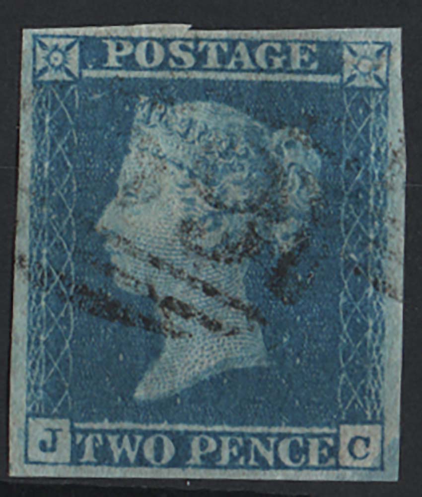 GB 1841 2d blue plate 3 JC very fine used 4 good margins, NE square splayed out & break in frame – plate breaking? Sg14 [ref: 294/136 sa/am0088]