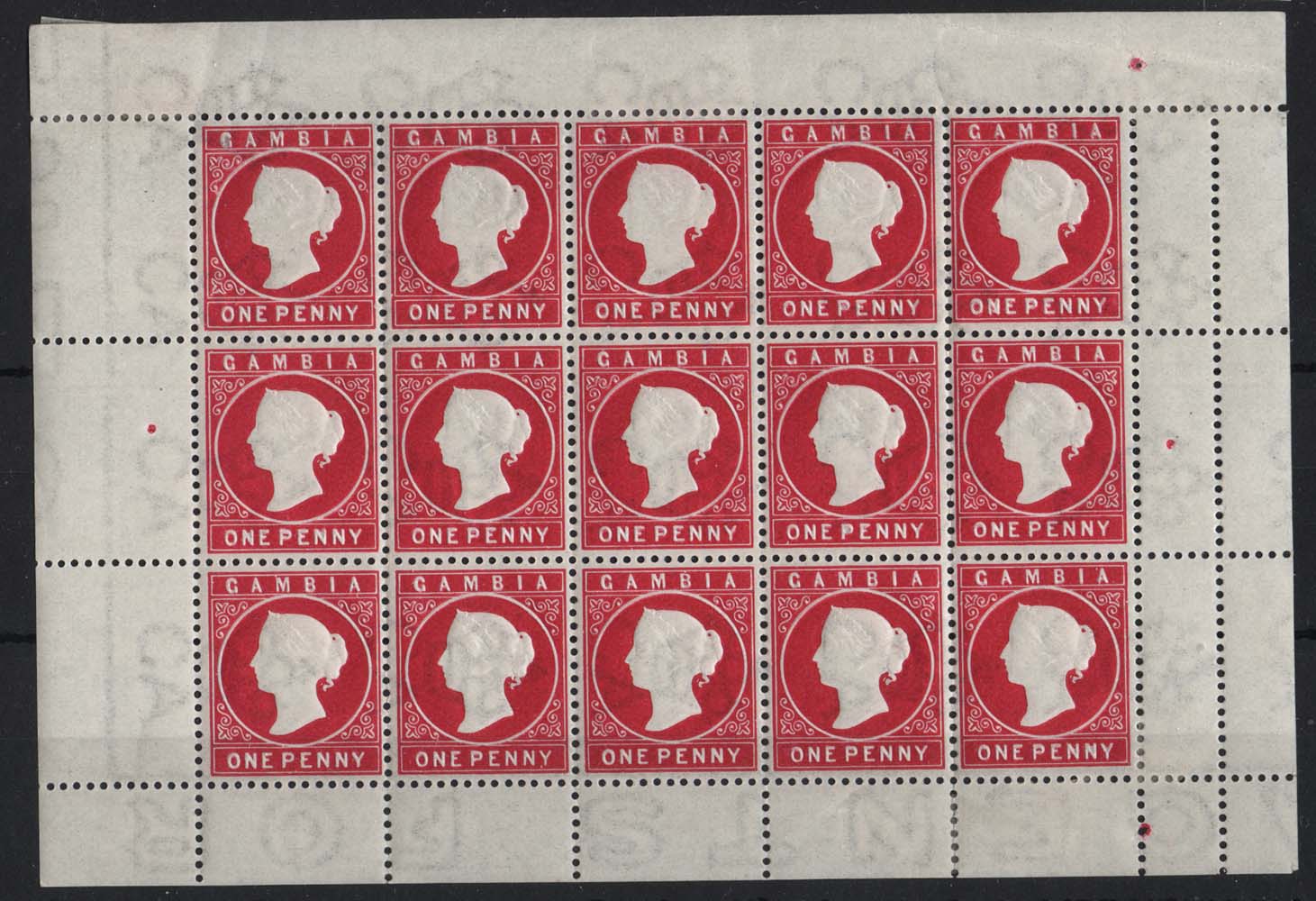 Gambia 1886 1d aniline-crimson wmk CA sg23a fine fresh complete pane of 15, 13x um, margin crease top right, c£127 as mm singles [ref 293-143/sa/ak0630]