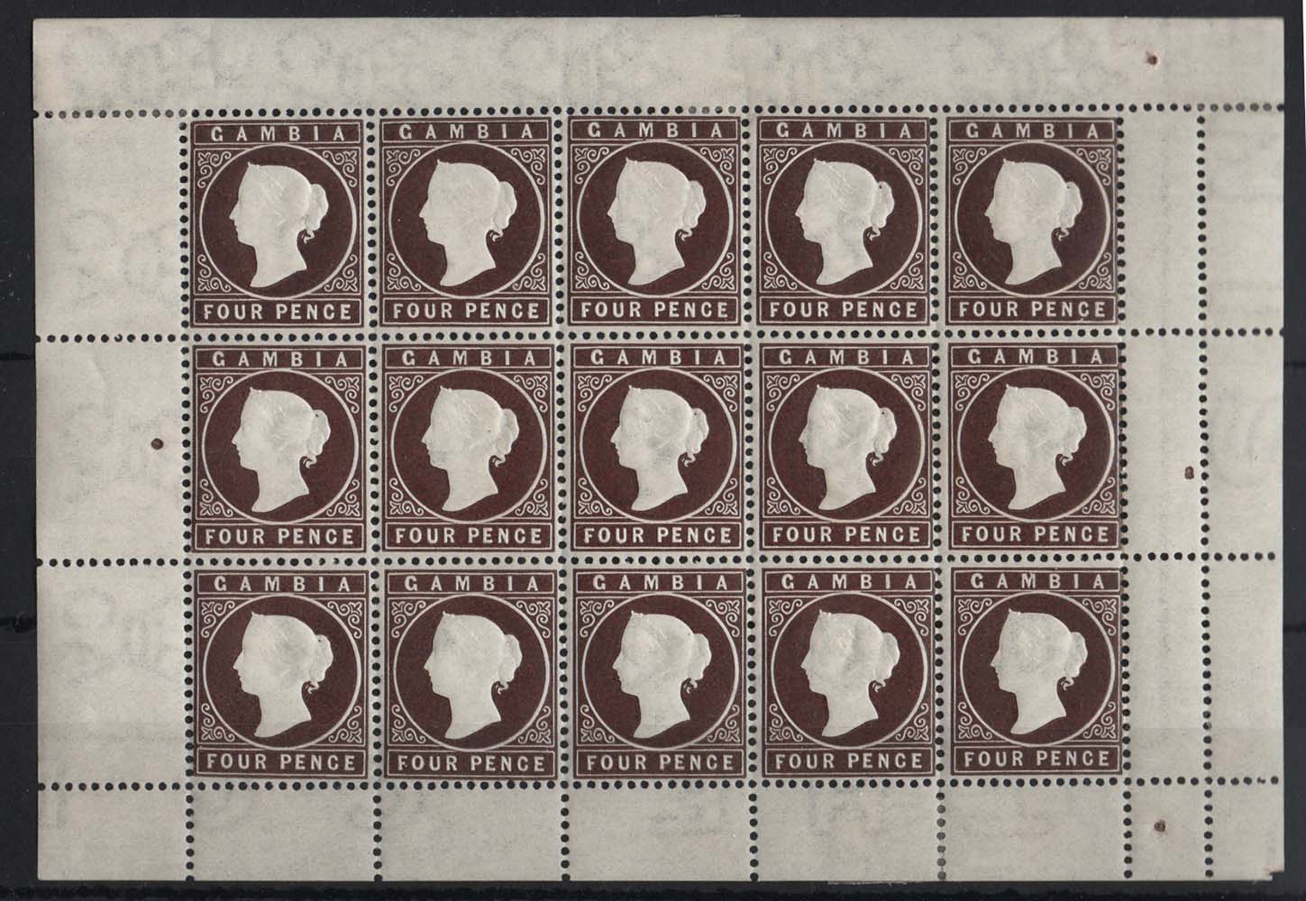 Gambia 1886 4d deep brown wmk CA sg31 fine fresh complete pane of 15, stamps um, c£195 as mm singles [ref 293-145/sa/ak0632]