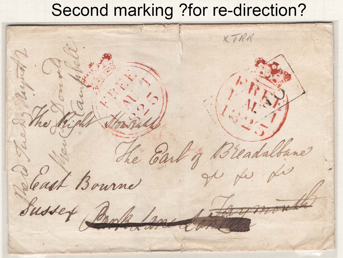 GB 1825 Cover with 2x ‘free’ marking in red, one for redirection, fine boxed KENMORE mileage mark on back – interesting [ref 293-150/b07/ak0053]