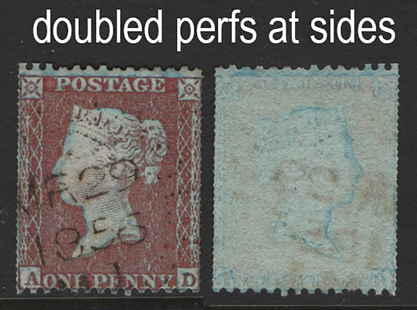 1d red wmk large crown perf 14 blue paper fu with apparently doubled perfs at sides error – measures as perf 14×28 sg29var, offered ‘as is’