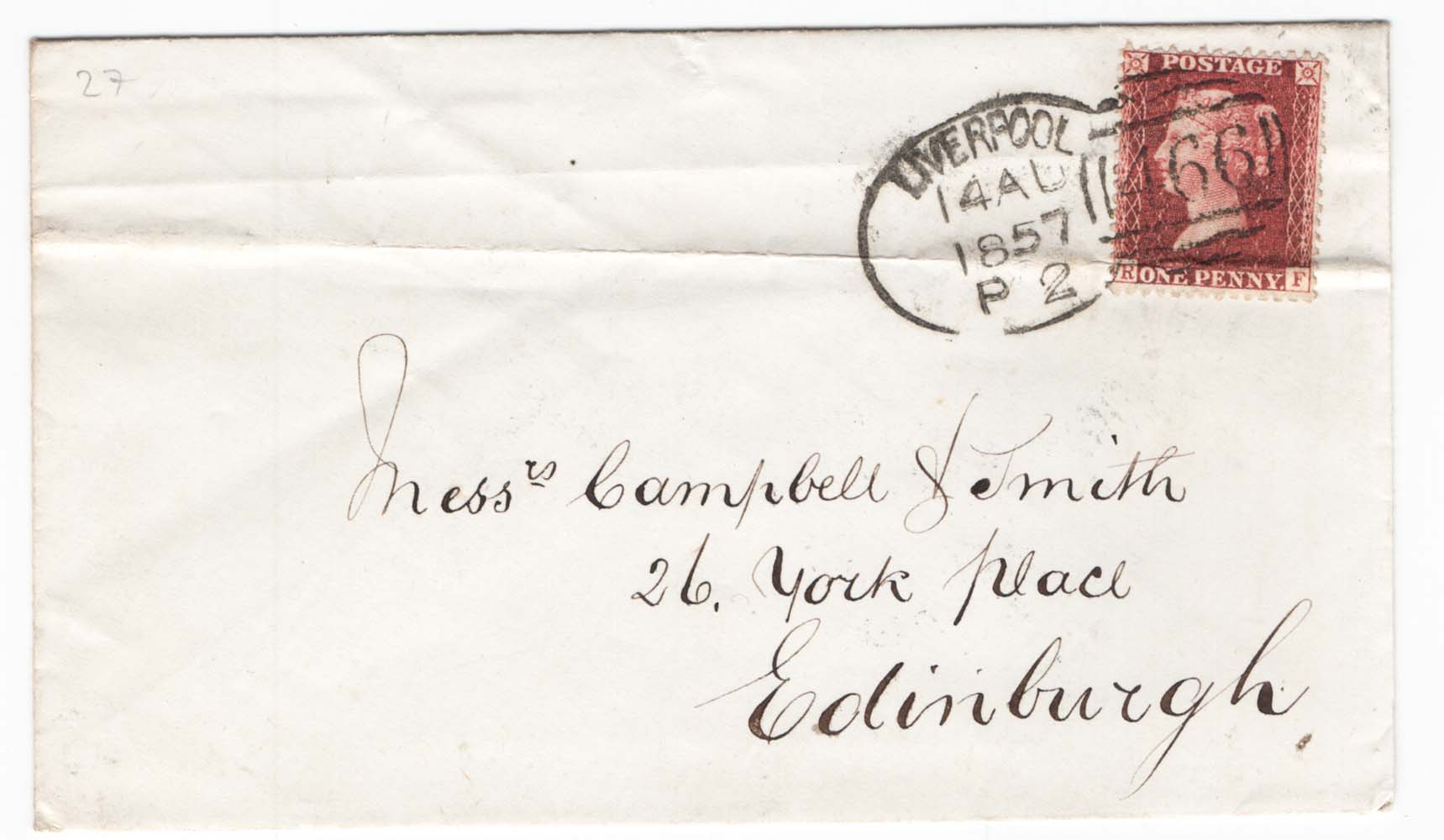 1d red sg40 on 1857 cover to Edinburgh, fine Liverpool code P2 spoon, Edinburgh P-F receiver on back, horiz crease