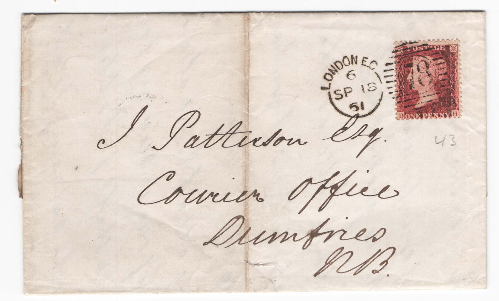 GB 1854 1d red plate 43 DH, sg40 on 1861 cover to Dumfries, fine hooded (without outline) London ’78’ code 6P2 duplex [ref: 294/194 sa/am0145]