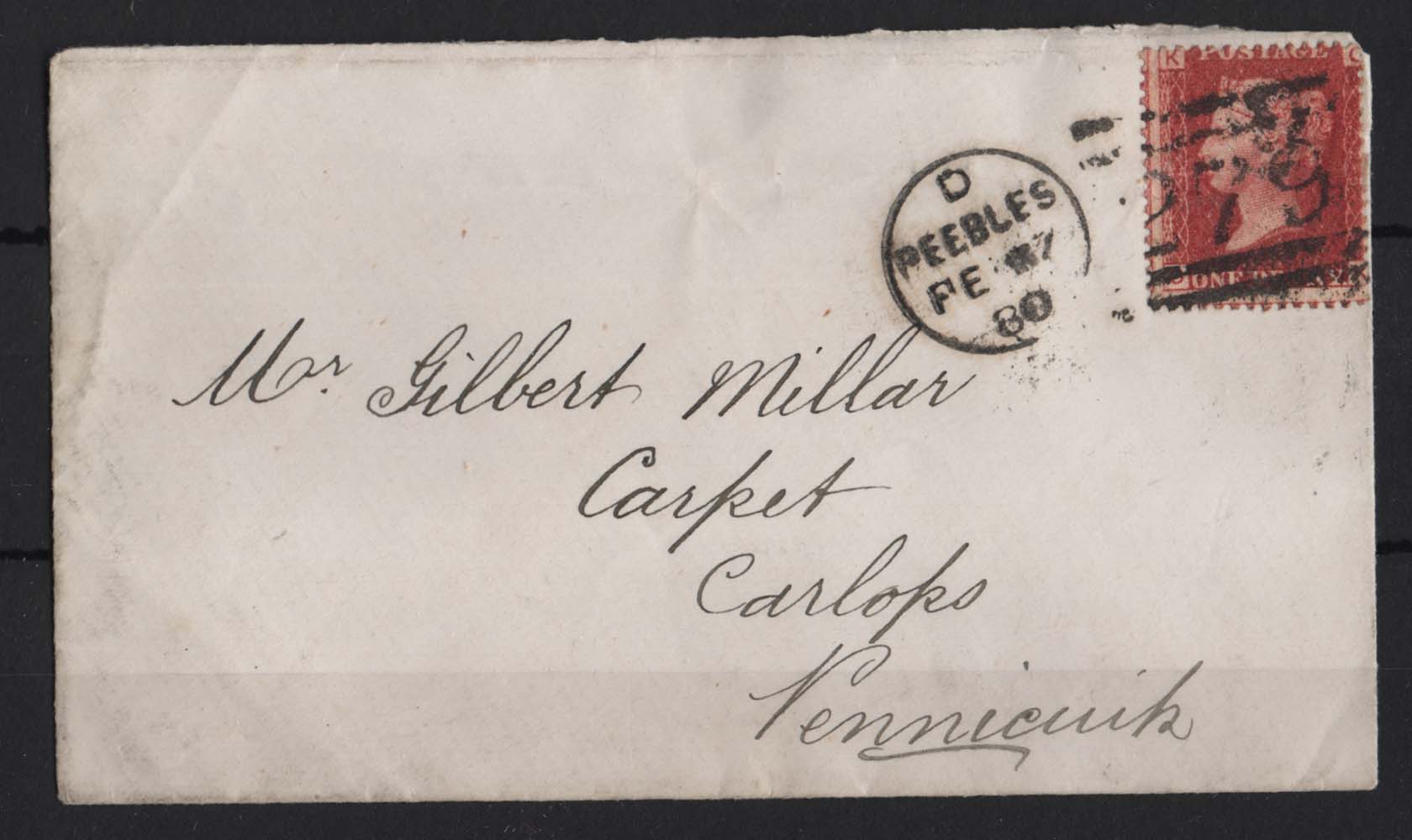 GB 1858 1d plate 225 sg43 fine used on neat cover from Peebles to Pennycuick cat £2000+ using SG scaling factor [ref 291-207/sa/9q0163]