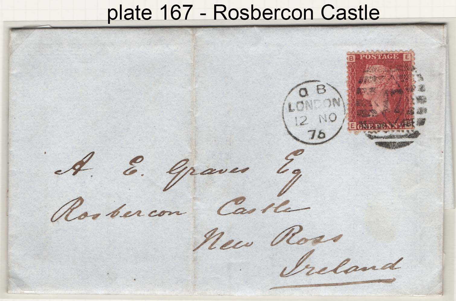 1d red plate 167 fu on EL London to Rosbercon Castle, New Ross, Ireland sg43