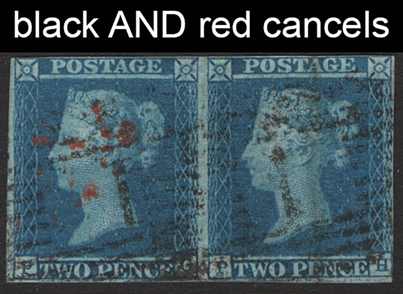 GB 1841 2d plate 3 PG-PH, vgu pair, Scots cancel in black + indistinct red cancel, 4 close margins just touched H-square sg14 [ref 293-219/sa/ak0064]