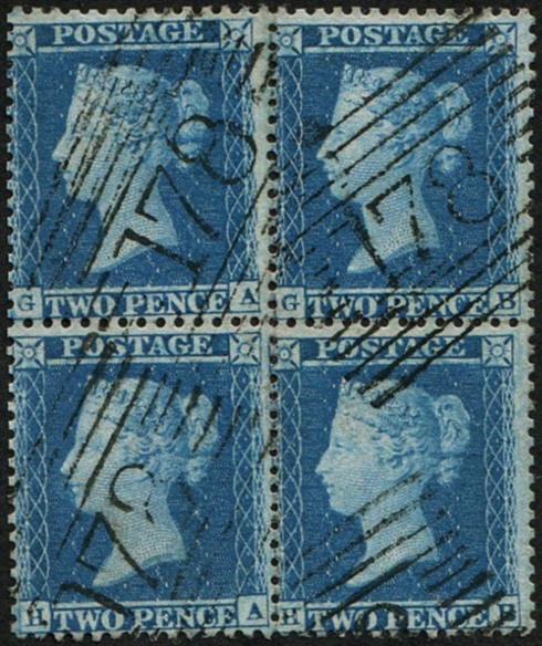 GB 1854 2d blue sg23a plate 5 GA-HB BLOCK OF FOUR vfu, Scots 178 numerals (Huntley) scarce multiple this fine Spec F3 c£2,500 [ref 293-243/sb/al032]