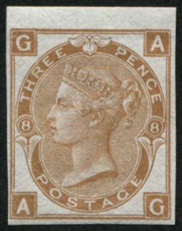 GB 1867 3d sg103, plate 8 IMPERF COLOUR TRIAL IN OLIVE-BROWN good four margins, pristine fresh (cat £2,500) [ref: 294/244 sb/an029]