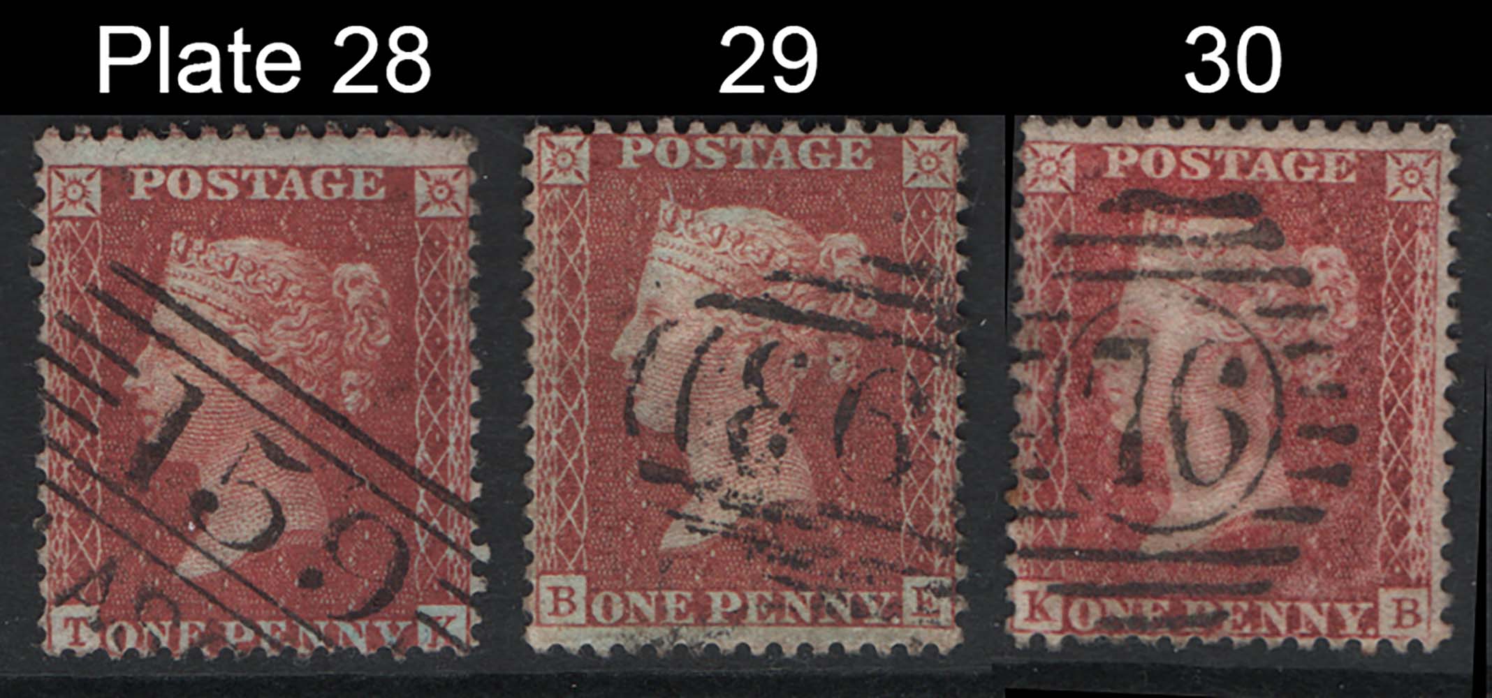 GB 1854 1d red LC14 plate 28 TK, plate 29 BE, plate 30 KB fu sg29 C8