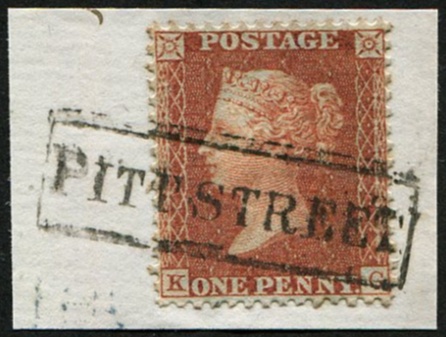 GB 1854 1d red sg29 plate 32 KG ‘PITT STREET’ SCOTS LOCAL BOXED CANCEL complete strike tying to small piece Spec C8 [ref 293-250/sb/al033]