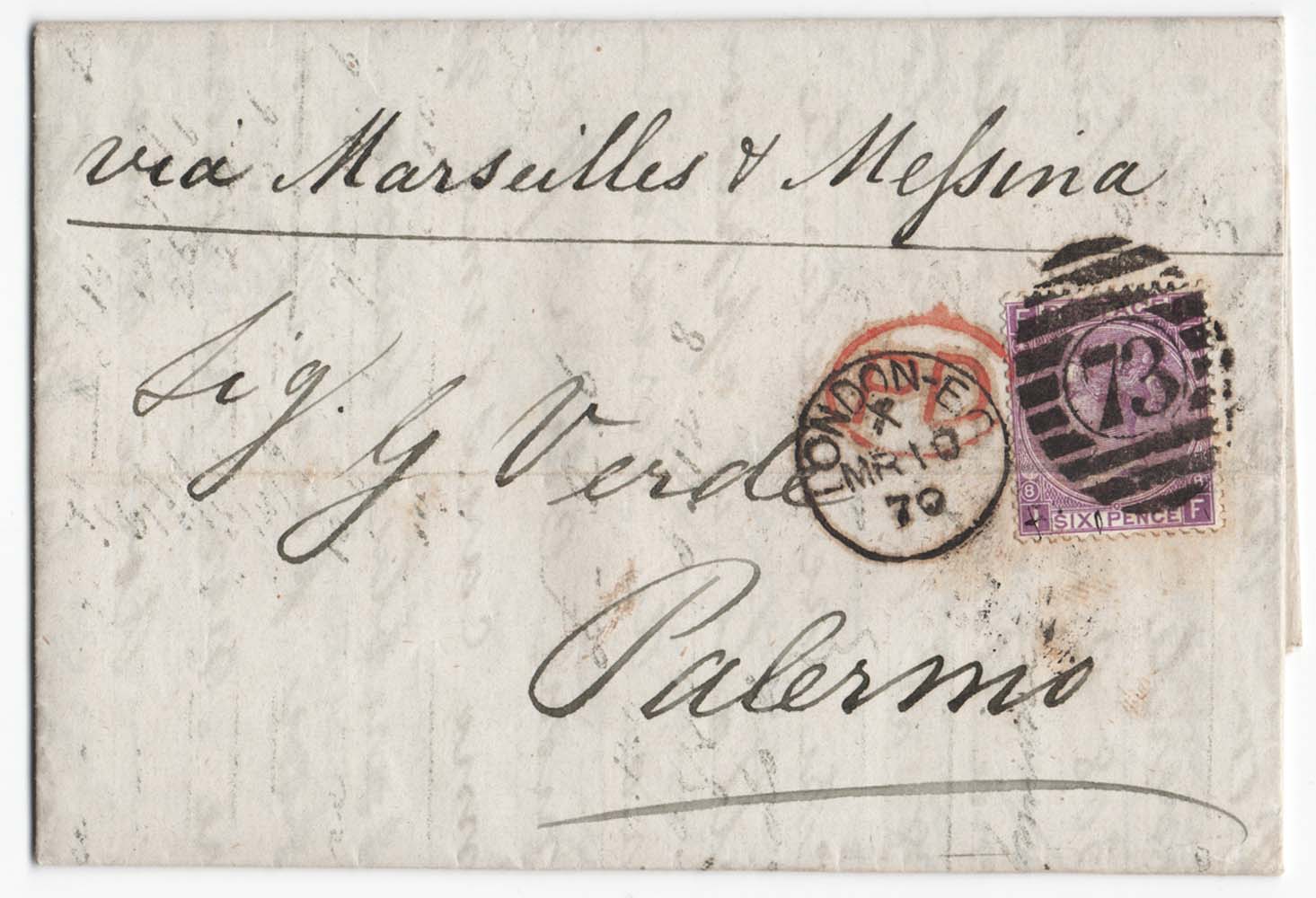 6d mauve plate 8 vgu on neat 1870 entire letter London to Palermo sg109 c£140