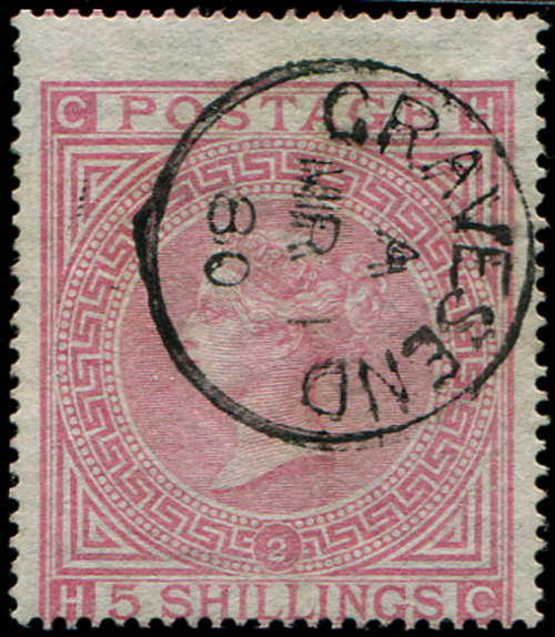 GB 1867 5s sg127 plate 2 pale rose very fine used, crisp Gravesend 1880 cds cat £1500 [ref 291-263/b07a/8j191]