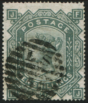 GB 1867 10s GREEN sg128 fine used, London ‘L.S.5’ numeral, re-perfed on R/H side, otherwise fresh, sound & good colour cat £3,200 [ref: 294/265 sb/an035]