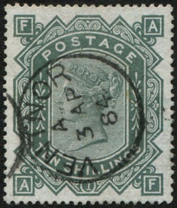 10s GREEN sg131 (BLUED PAPER) wmk anchor Deep Shade vfu, well centred crisp Ventnor 1884 cds. Fresh & fab colour. Scarce this fine.