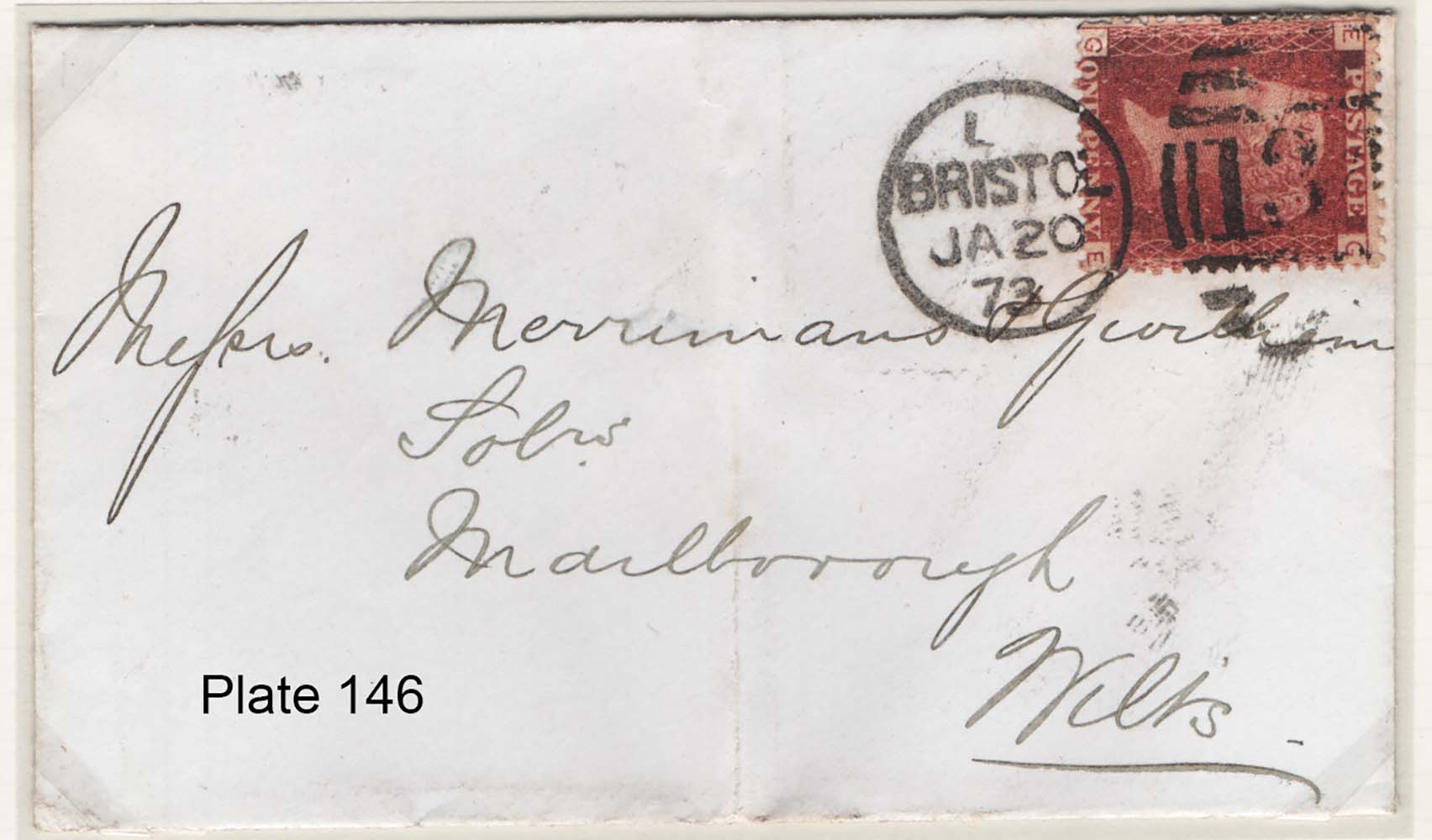 GB 1858 1d red plate 146 fu on 1873 cover to Marlborough, Bristol duplex sg43 [ref 293-271/b07/ak0079]