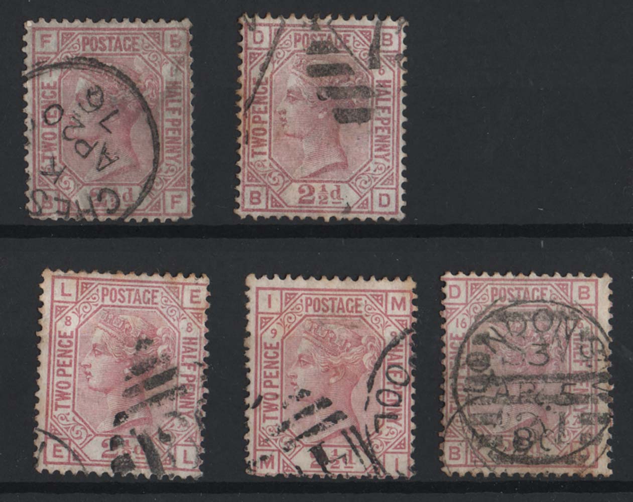 GB 1873 2½d rosy-mauve plate 1 sg139, then sg141 plates 6, 8, 16, very good used cat £195 [ref: 294/277 sa/am0422]