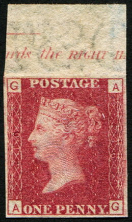 GB 1858 1d sg43, plate 186 AG IMPRIMATUR, top marginal, inscription v fine unused [ref 293-282/sb/al039]