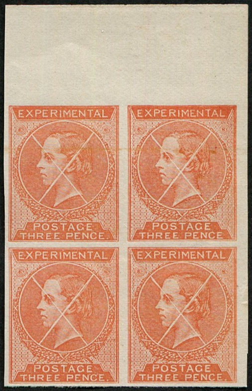GB 1861 DE LA RUE EXPERIMENTAL ESSAY 3d IN ORANGE, head of The King of Portugal, imperf plate proof block of four top marginal, fresh & scarce See sgVolume1, page 180 [ref 293-288/sb/al048]