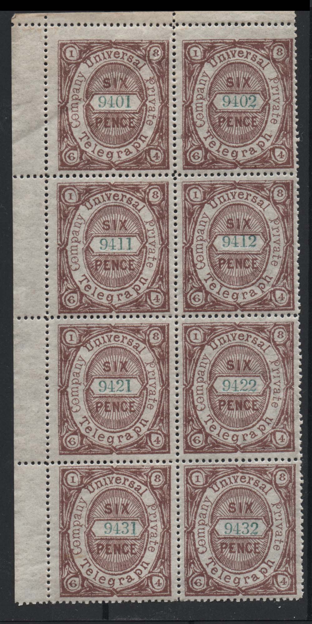 Universal Private Telegraph Co 6d stamp, um blk of 8, fault on corner copy, v fresh