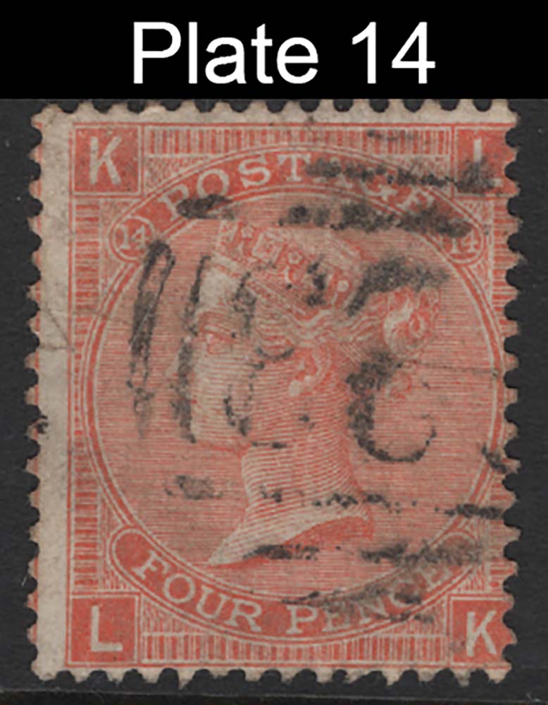 GB 1865 4d dull vermilion plate 14 small imperfection otherwise fu sg93 c£110 [ref 293-294/s/ak0476]