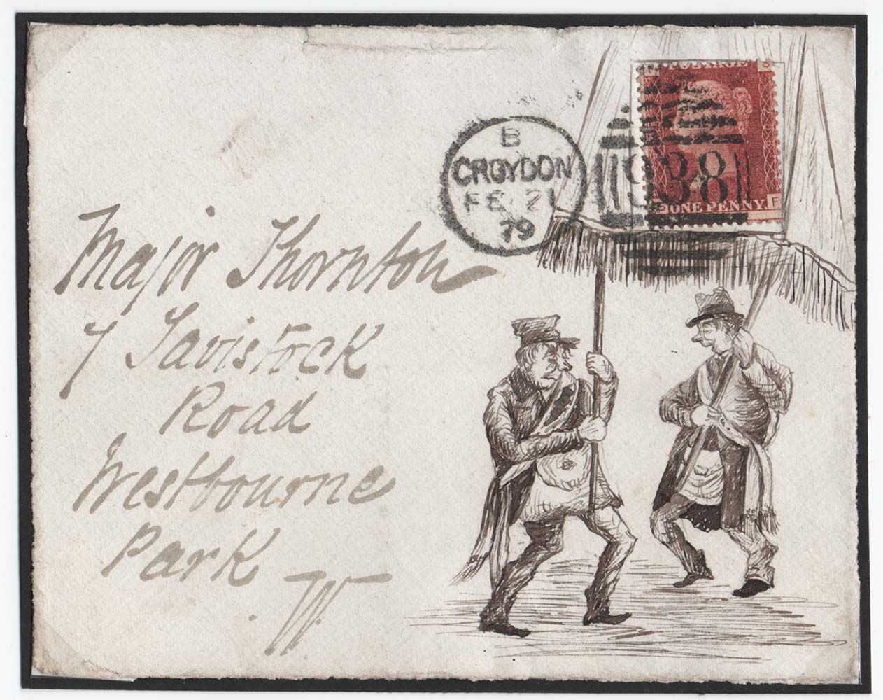 GB 1879 Fine illustrated front franked 1d plate 205 from the Major Thornton correspondence depicting 2 men holding banners [ref: 294/305 l/am0027]