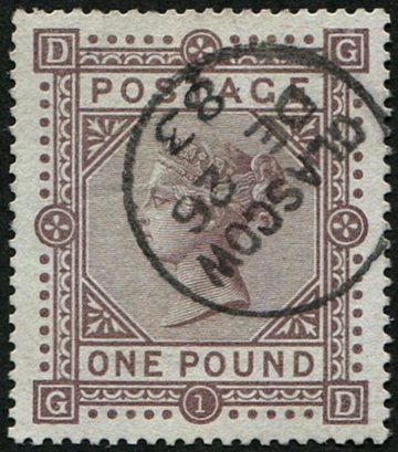 GB 1867 £1 BROWN sg136 watermark ANCHOR DEEP SHADE, SUPERB USED, well centred, crisp Glasgow1883 cds Super fresh & fab colour Scarce in this quality, BPA Cert [ref 293-316/sb/al063]