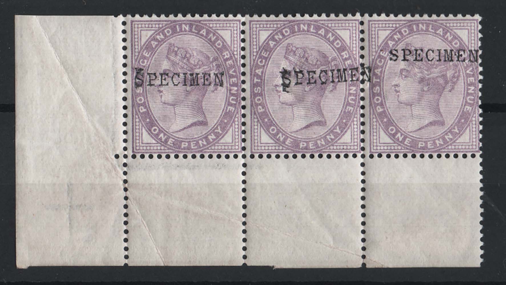 1d lilac, corner strip of 3 without jubilee lines ovpt Specimen type 9, stamps um, sg172s c£180+ as mm