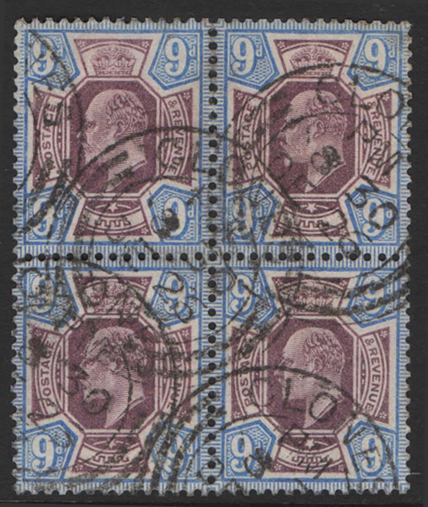 GB 1902 9d dull purple & ultramarine fu cds blk of 4 sg250 c£375 as block ae0113 sa 289/ #324