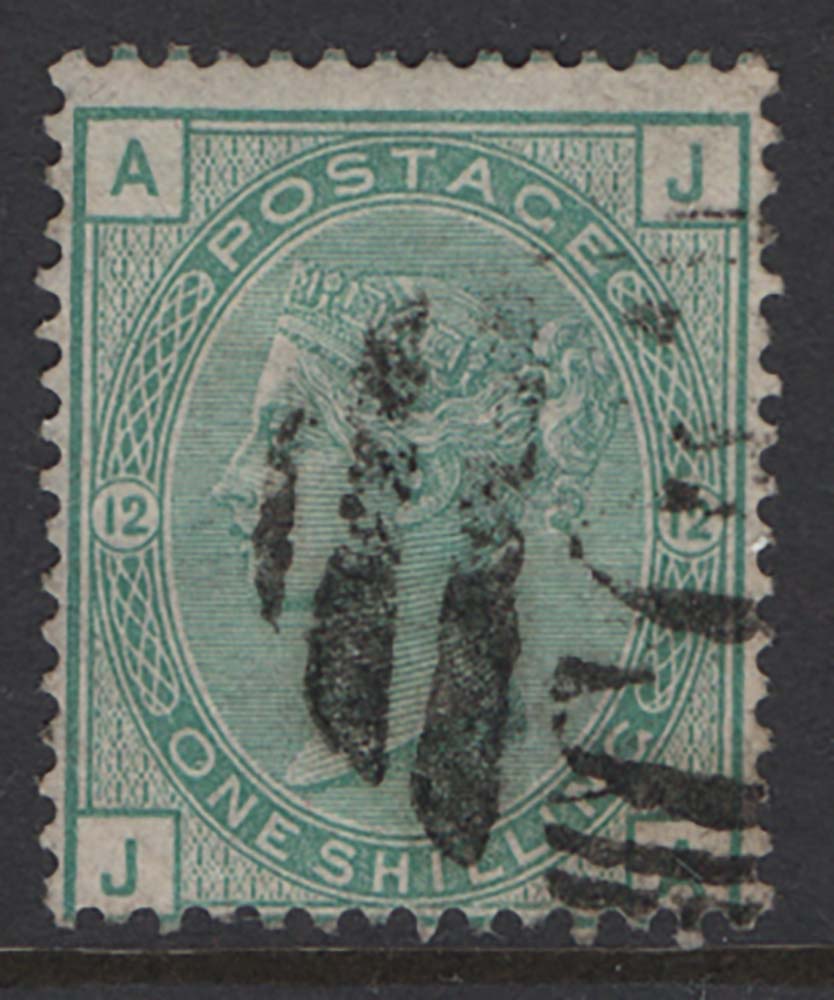 GB 1873 1s green plate 12 sg150 fu, possibly used abroad c£160 [ref 290-357/l/ag0300]