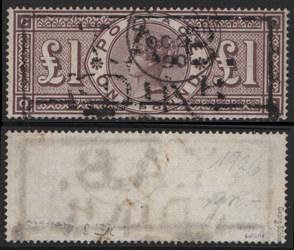 GB 1884 £1 brown watermark crowns sg185 very fine used, crisp cds + box cancel, rich colour cat £2750 [ref 291-372/sa/ai0325]