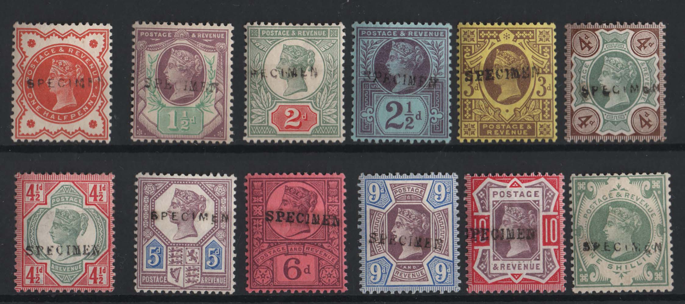 GB 1887 ½d – 1s Specimen set of 12 very fine mint (some um) – ½d, 2d, 4d, 5d, 1s are the scarcer type 12, sg197s-211s cat £1100+ as mm, basic type 9 ovpt [ref 291-375/sa/ai0288]