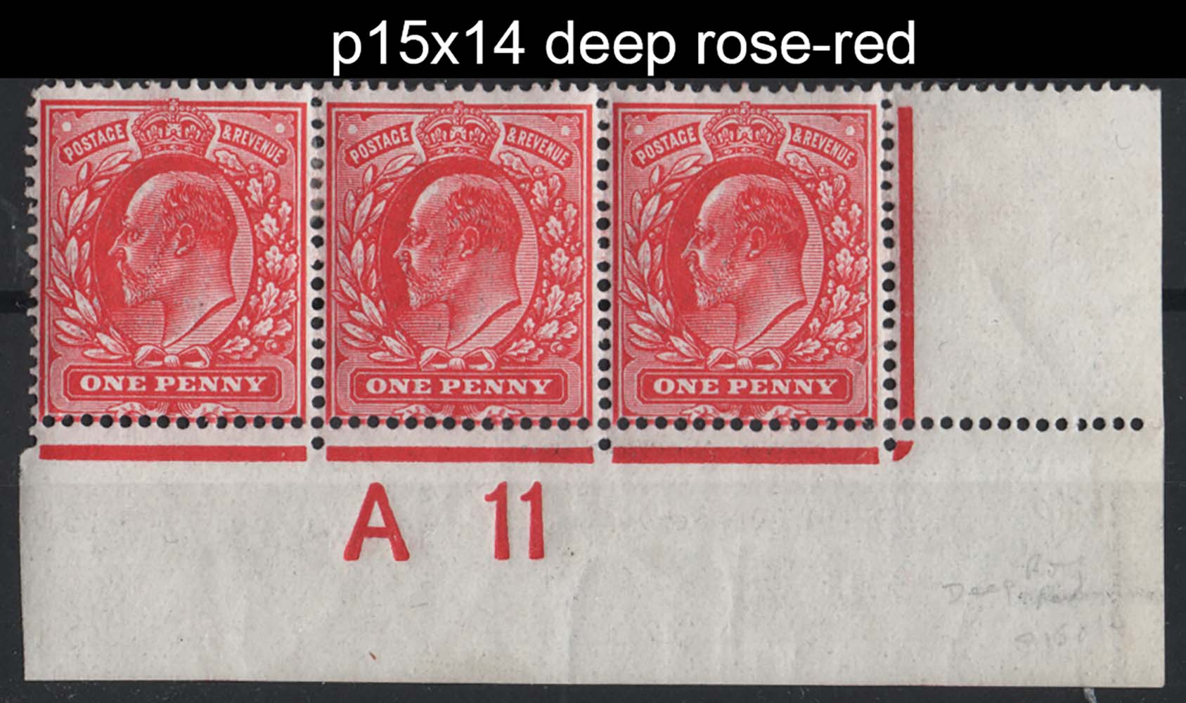 1d rose-red (deep shade) perf 15×14 A11 corner strip of 3 f mint, 1x um, sg280 c£155 as singles, or £325 if deep rose-red Spec M7(2)