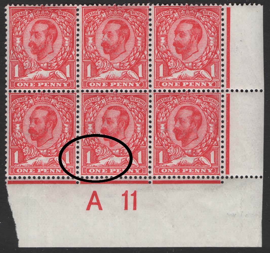 GB 1911 1d die 1b wmk crown sg329var r20/11 white scratch left of lion Spec N8i um A11(c) corner blk of 6 perf type 2