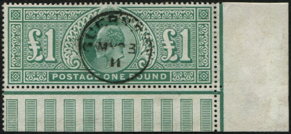 GB 1902 £1 GREEN sg266 very fine used, CORNER MARGINAL upright central Guernsey1911 cds Very scarce to get a corner copy cds [ref 293-392/sb/al090]